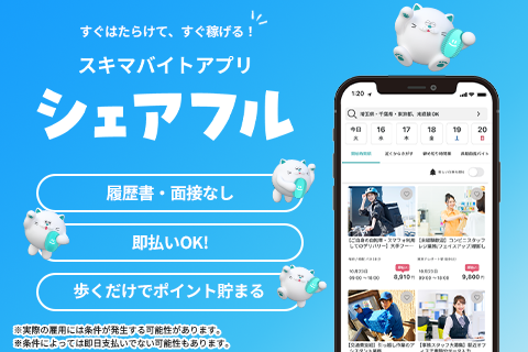 最短当日から働け、給与を即日受け取れる仕事もあるので、資格なし未経験の方に非常におすすめです。また、ポイ活機能の搭載もあり、バイトとセットで利用することができます。